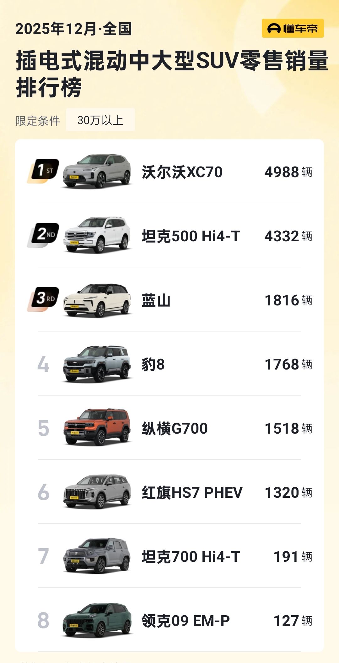 最后我们来看看2台SUV的价格与权益,全新Q5L目前是预售阶段,预售价31.3万起;全新XC70则是26.99-34.99万的限时尊享价,并且推出了包含14000元购置税补贴、3年3次免费保养在内的限时政策,目前该车也已经获得了超1.4万位用户的认可,12月销量4988台蝉联品牌月度销冠。