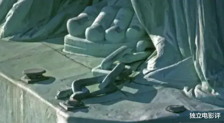 女神的脚部有条被挣脱的脚链,象征奴役、压迫时代的终结:
