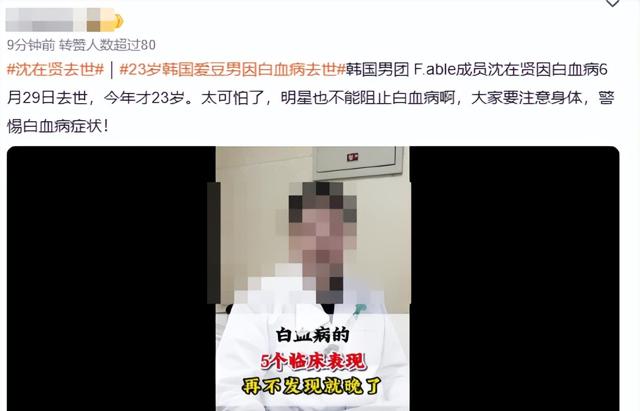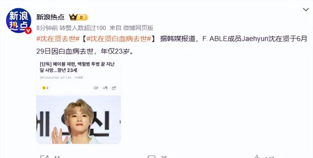 据韩媒7月2日报道,韩国男团F.able成员沈在贤因白血病去世,年仅23岁。