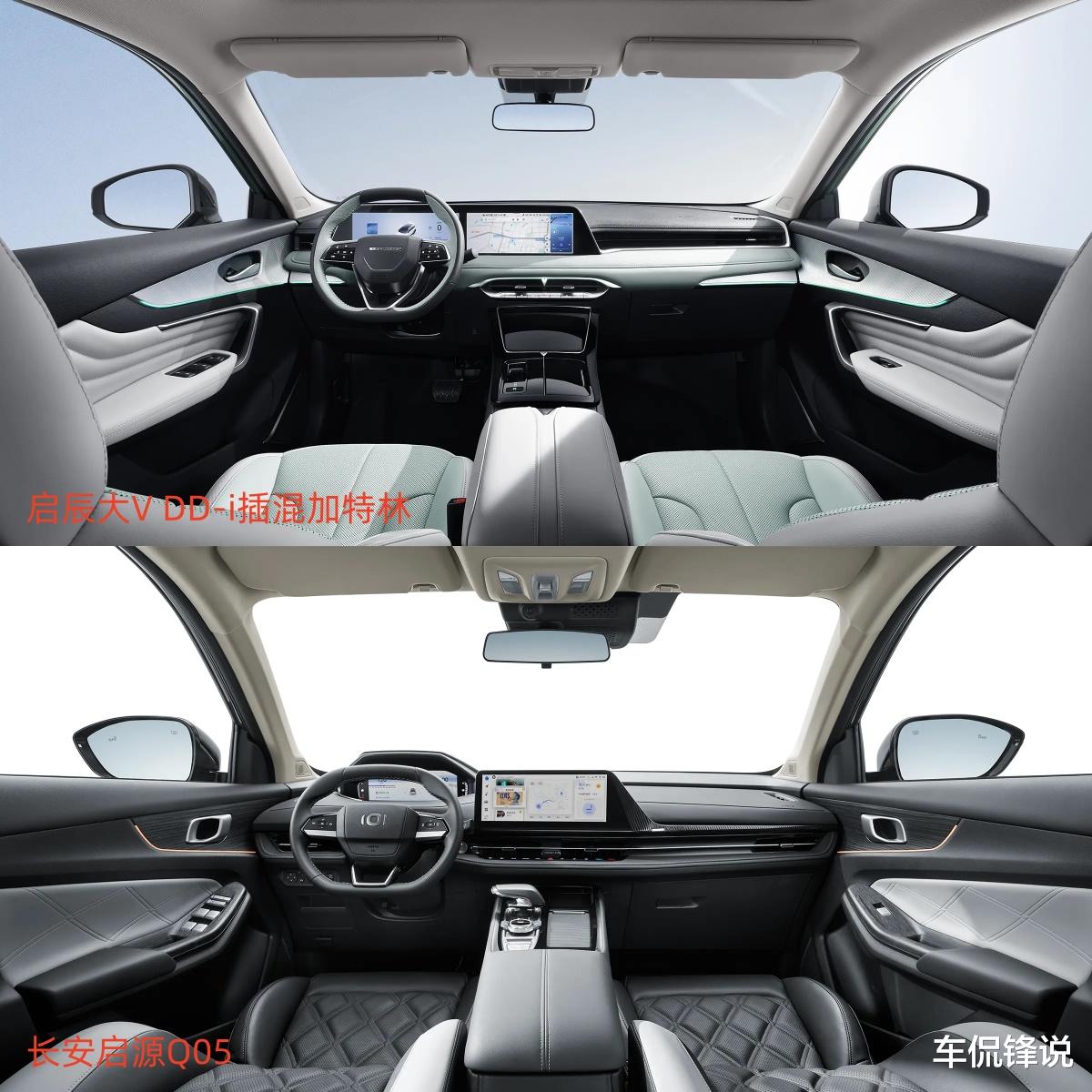 两车的内饰设计其实存在一定的相同,特别是中控屏就基本一致样式,当然了两车的内饰细节上还是不同的。启辰大V DD-i插混加特林采用的是联屏,双12.3英寸的屏幕组成了联屏,看上去整体感会更强。而长安启源Q05是常规仪表跟中控屏,中控屏一样是12.3英寸,但仪表更小一些为10.25英寸。车机智能化方面,启辰大V DD-i插混加特林内置的是启辰V-Link智联系统,支持双区域语音识别控制、语音连续识别、声纹识别等;而长安启源Q05搭载的是启源OS、相对来说这个系统较为封闭一些,可玩性稍微差一些。