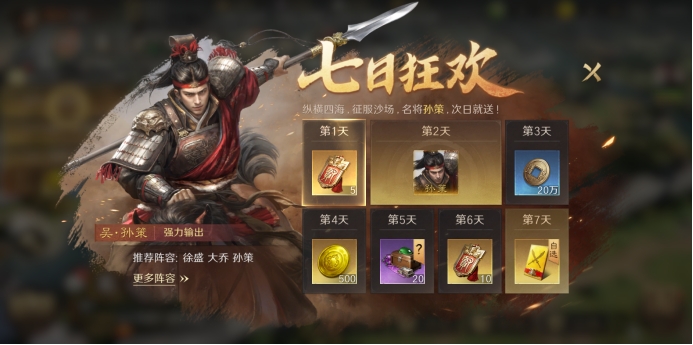 除了这些,游戏在其他方面也表现得相当出色。它的充值性价比很高,高性价比抽卡还有公开的高橙将概率与保底机制,6元充值赠金也很实惠,整体付费压力比传统SLG小很多。而且新人福利丰厚,创建角色就能领全服预约奖励,里面有橙将和资源,七日狂欢活动次日还送橙将孙策及自选战法包。