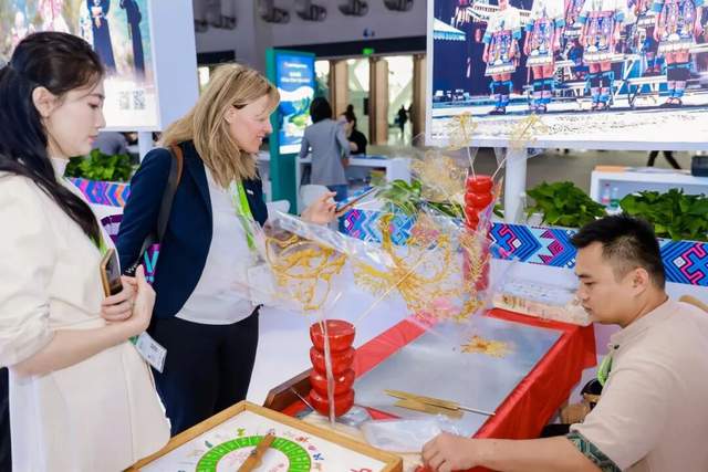 广西此次参展参会,收获颇丰。广西入境旅游企业总体接待外宾人数约750人次,外宾咨询量达1000人次,有效洽谈数量约150人次,精准高效的对接为广西入境游的发展注入新的活力。此外,壮锦、糖画、珍珠、六堡茶等非遗产品备受各国游客青睐,总销售额超10万元,凸显了全球各地游客对广西好物的认可与喜爱。