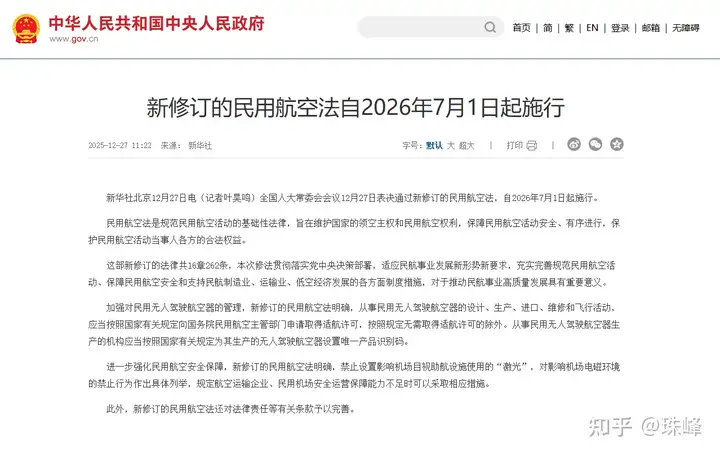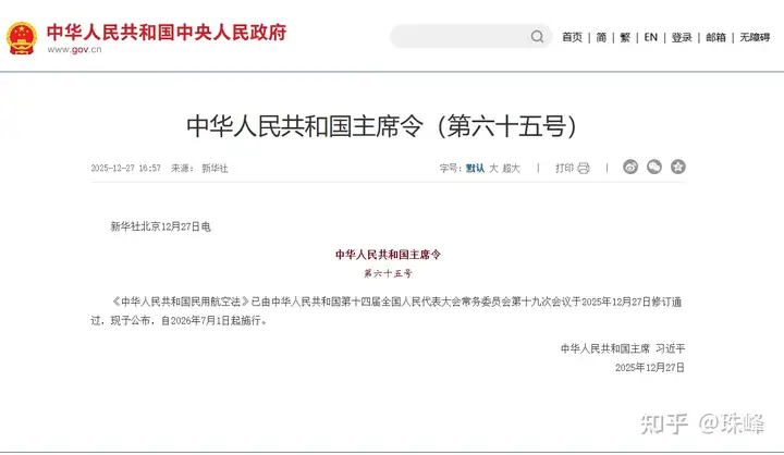 2025年12月27日,十四届全国人大常委会第十九次会议三审表决通过了修订后的民用航空法,将于2026年7月1日起施行。