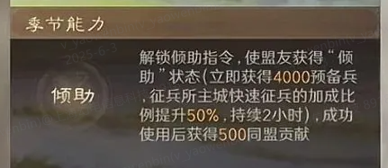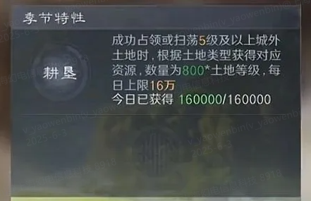 S8赛季新增动态季节变化,每个季节提供独特增益与战术机会。这种机制要求玩家根据季节变化来调整战略部署,从而更好地适应战场环境的变化。其中春季的季节特性“耕垦”可以在占领5级以上资源地时获得额外资源,每日上限16万。