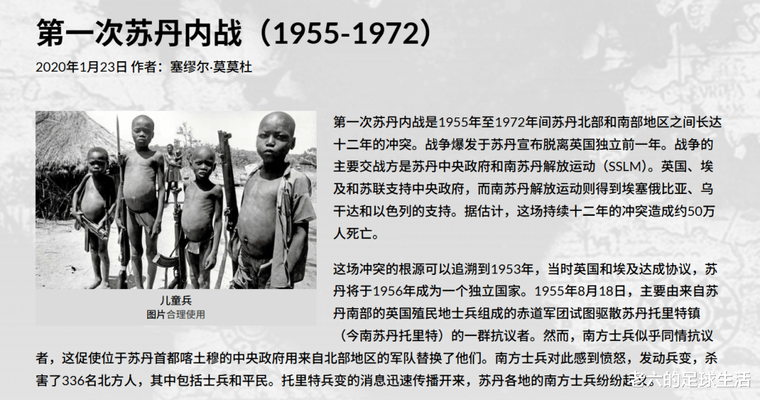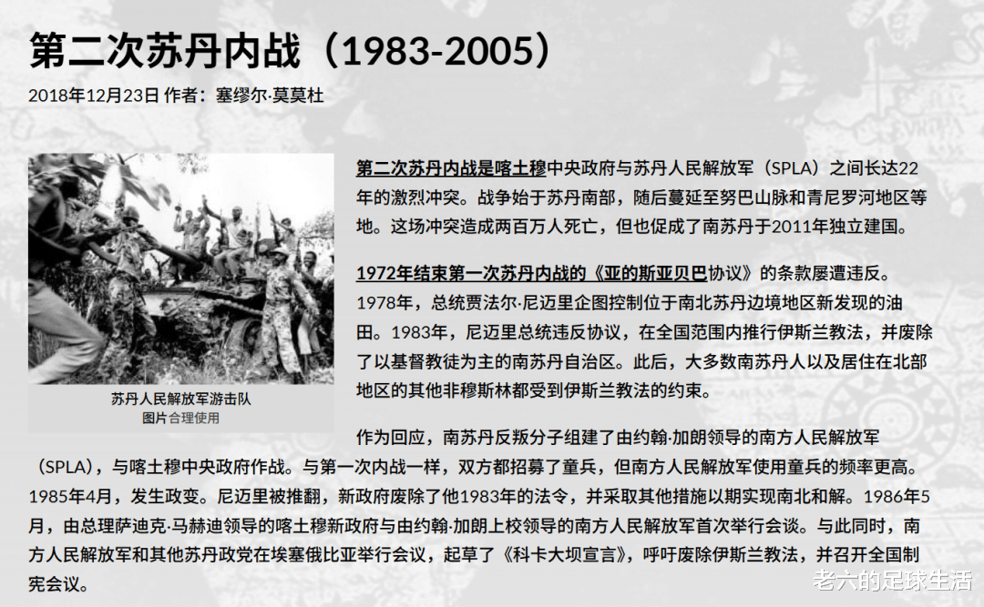 今天提到苏丹的足球就不得不提到他们的国家,苏丹自从1956年以来就经历了20次的军事政变,1955~1972和1983~2005这个国家就爆发了两场内战,导致了150万人死亡。