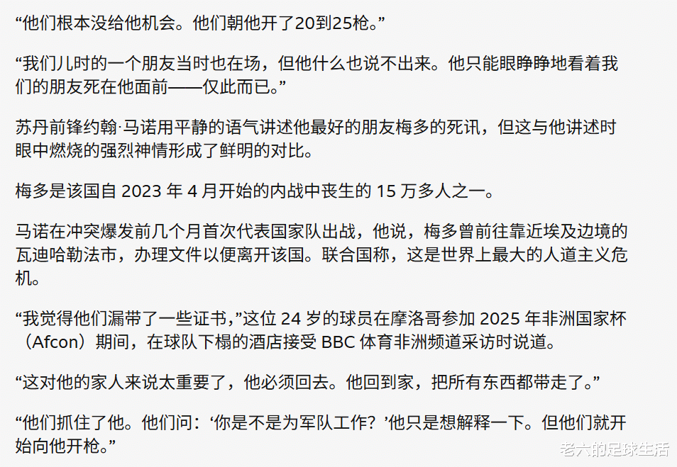 本场赛前苏丹的前锋马诺在接受采访就提到他最好的朋友梅多就丧生在了内战。