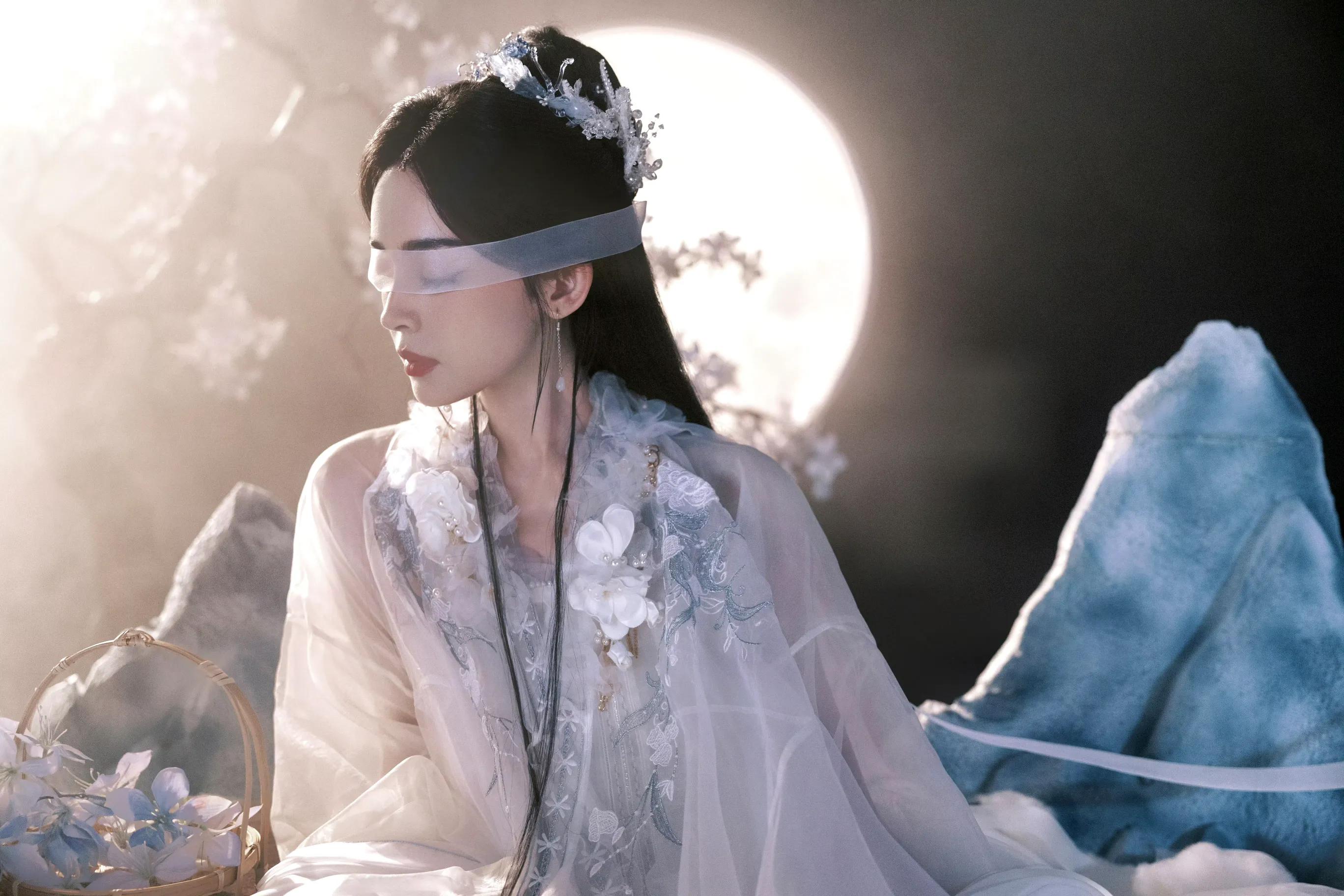 古力娜扎一袭古风纱衣,气质清冷飘逸。纱裙飘逸,头饰精致,浓颜系五官在黑夜中宛如发光,完美还原神话形象。