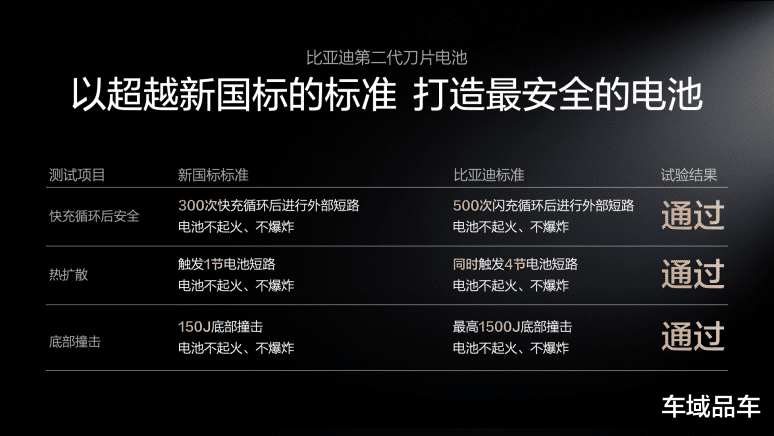 第二代刀片电池继续将安全进行到底,通过一系列超越新国标的安全测试,为用户打造最安全的电池,确保电池全生命周期都安全,彻底打消用户的安全顾虑。