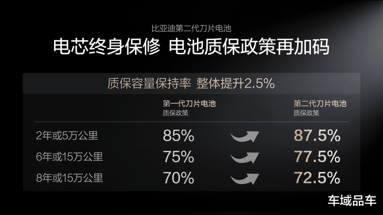 第二代刀片电池通过打造“锂离子高速通道”和“全温域智能热管理系统”,实现了更低的产热和更高效、均匀的散热,让闪充对电池寿命几乎没有影响。基于这样的底气,比亚迪还宣布电池质保政策再加码!第二代刀片电池质保的“容量保持率”整体提升2.5%,电芯依旧是“终身保修”,这就是第二代刀片电池,给所有用户的安心承诺。