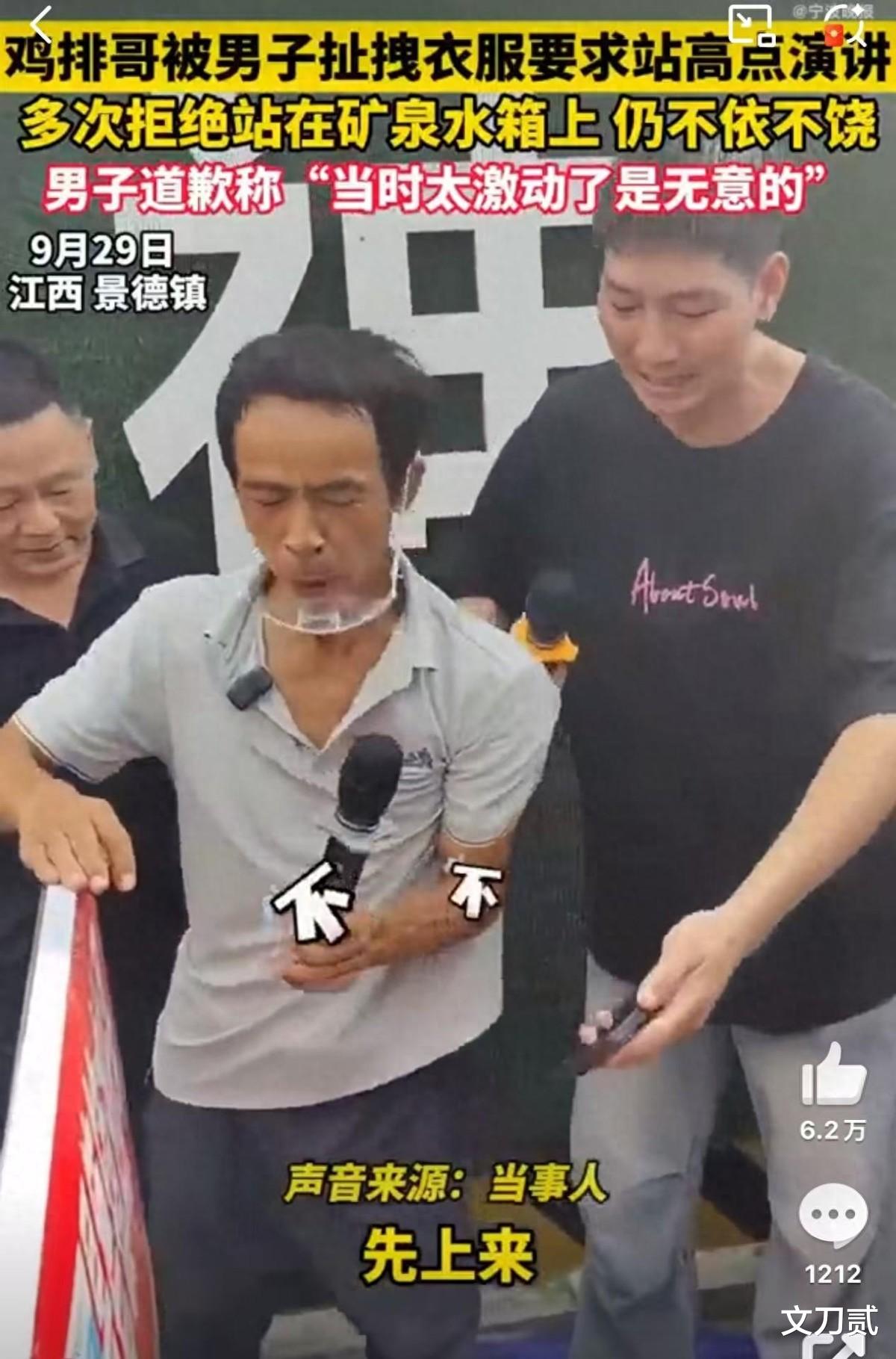 9月29日,江西景德镇网红“鸡排主理人”李俊永在公开活动发言时,被身旁的一个陌生男子拉拽,该男子让鸡排哥站到矿泉水箱子上进行演讲,可鸡排哥却对他的这一无理行为表示拒绝,并声称矿泉水是用来饮用的,不能上去踩。
