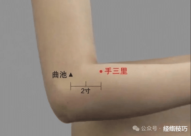 先把胳膊弯成90度,就像平常搭桌子的姿势,手肘内侧有一道清楚的横纹,找到横纹的末尾,往下数三指宽,摸到稍微凹陷的地方就是手三里。每个人手指粗细不一样,不用准确到毫米,位置对了、按下去有酸胀的感觉就没问题。