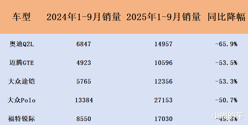 奥迪Q2L、大众迈腾GTE、大众途铠、大众Polo以及福特锐际分列第十一至十五名,前三季度销量分别是6847辆、4923辆、5765辆、13384辆以及8550辆,对应的同比跌幅是54.2%、53.5%、53.3%、50.7%以及49.8%。
