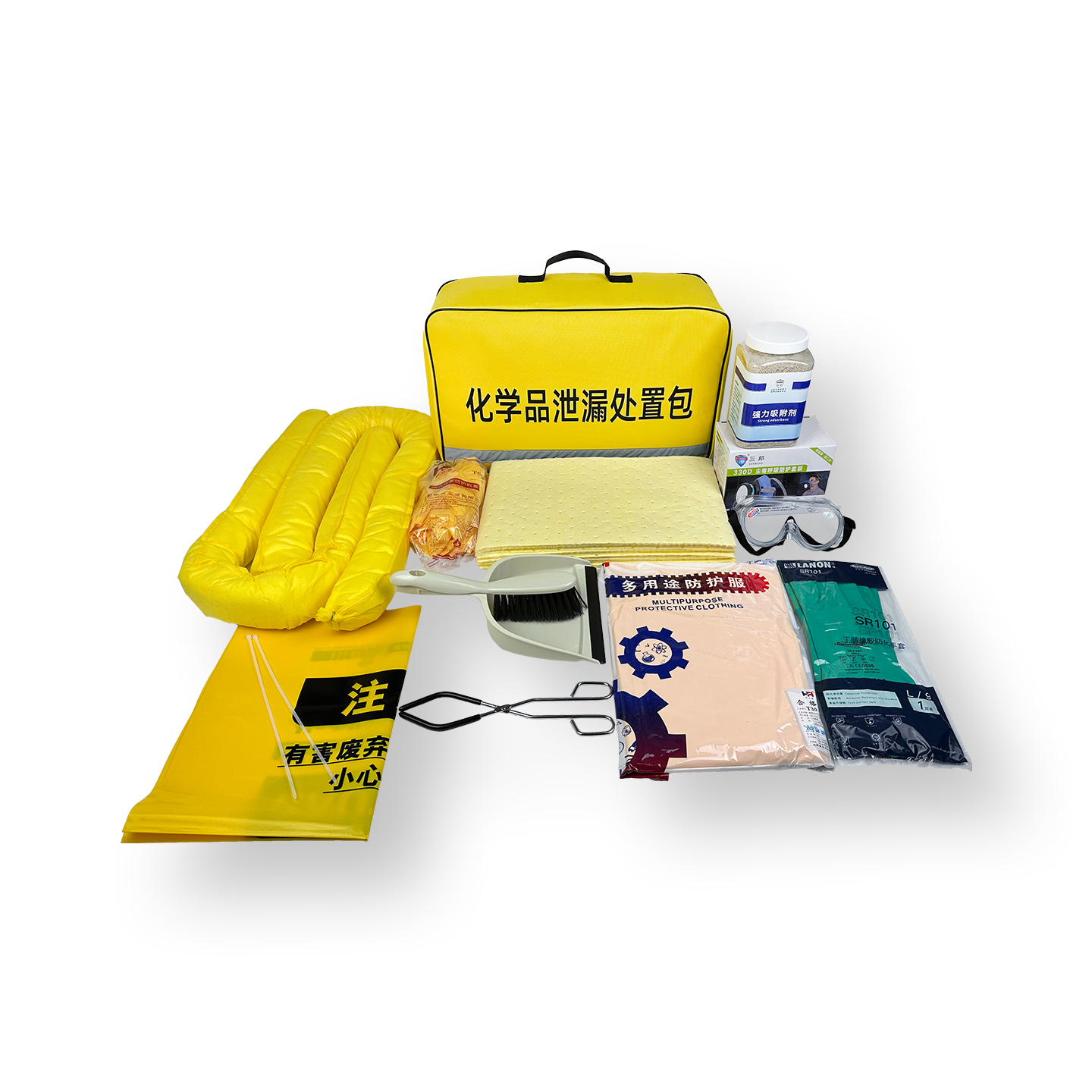 (一)配置全面,覆盖处置全流程不同于普通应急包的单一配置,乐治处置包实现了“防护-吸附-清理-处置”一站式全覆盖,无需额外搭配其他应急工具,可快速响应各类突发泄漏。其基础配置包含三大核心模块,全方位满足处置需求:一是吸附模块,根据型号差异,配备吸附棉片、吸附条、吸附剂等,可精准匹配小型至中小型泄漏场景;其中吸附棉片、棉条能快速吸附各类腐蚀性、有毒性液体,吸附饱和后不有效避免二次泄漏。二是个人防护模块,涵盖防护手套、防护反穿衣、防护眼罩、半面罩呼吸器、靴套等,全方位隔绝泄漏化学品与人体的接触,大幅降低中毒、腐蚀等安全风险。三是清理处置模块,包含清理工具、夹钳、废物处理袋、捆扎条等,便于快速收集吸附后的废弃物,实现泄漏物的规范收纳与转移。
