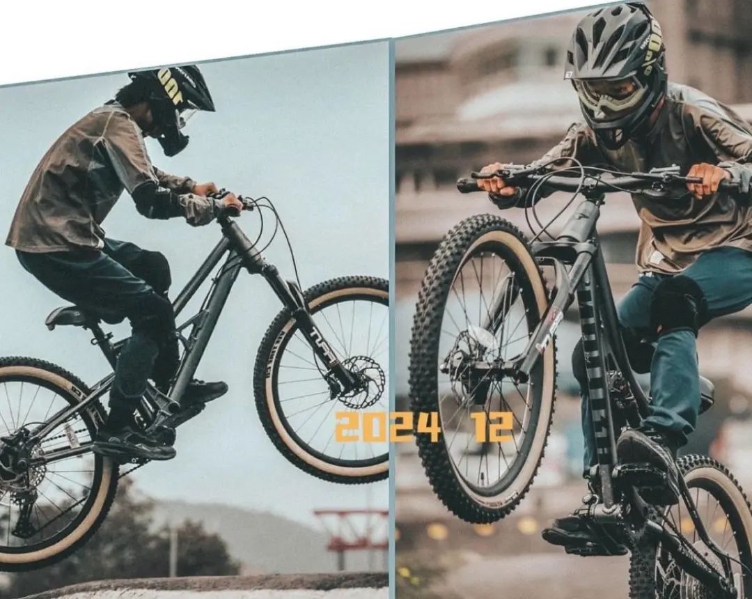 之前钟小江分享的儿子骑自行车的照片,戴着安全头盔、骑着山地车的钟小弟活力满满。