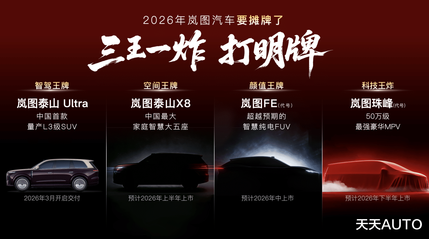 岚图汽车CBO、销售公司总经理邵明峰表示,岚图2026年的产品阵容将组成“三王一炸”王牌组合,岚图泰山Ultra是“智驾王牌”,岚图泰山X8是“空间王牌”,岚图FE(代号)是“颜值王牌”,岚图珠峰(代号)是“科技王炸”。全系车型均搭载L3级智能辅助驾驶硬件,将在驾控体验、智能交互、豪华品位等各方面给市场带来全新惊喜。4款重磅产品的组合,将成为岚图2026年提升市场份额、强化用户口碑、推动品牌体系全面进阶的组合王牌,必将重塑中国高端新能源市场格局。