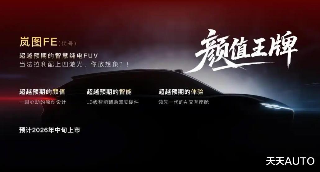 作为一款超越预期的智慧纯电FUV,岚图FE(代号)以超越预期的造型设计,赋予车型个性化的情感化表达,满足年轻用户独特的审美需求。此外,它将配备四激光雷达感知系统,搭载L3级智能辅助驾驶硬件,以及领先一代的AI交互智能座舱,为用户提供超越预期的智驾,和超越预期的AI交互体验。该车型将于2026年中上市,邵明峰表示:“岚图FE是岚图与华为乾崑的一次联手合作的全新起点,它不只是心中的热爱投射,更是一次彻底‘叛逆’,此款车型将科技的魅力与最原始的热爱融合一体,将成为年轻人心中的 Dream Car。”