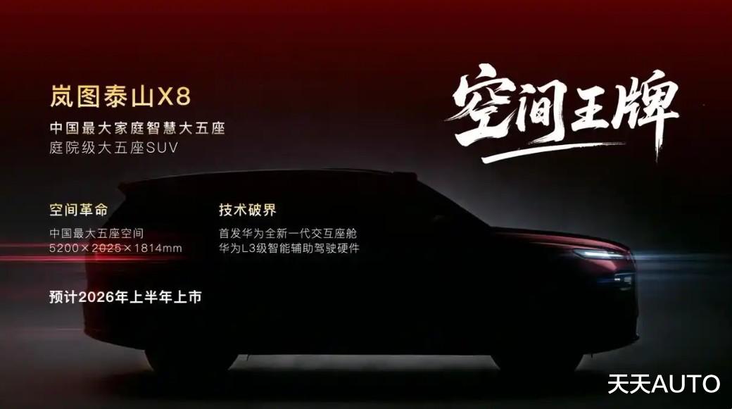 岚图全新推出的“庭院级大五座SUV”岚图泰山X8,致力于构建一个“可移动的家庭生活空间”,为中国家庭用户提供空间体验与智能出行解决方案。该车车长5200mm,宽2025mm,高1814mm,是“国内最大家庭智慧大五座SUV”,宽敞座舱设计可满足儿童自由活动、长辈舒适休憩等多元家庭出行需求。在智能化方面,岚图泰山X8将搭载华为最新一代智能座舱系统,并配备L3级智能辅助驾驶硬件,进一步强化其在高端新能源SUV市场的核心竞争力。该车型将于2026年上半年正式上市,是岚图扩充SUV产品矩阵的重要车型。