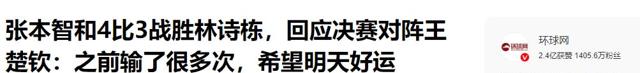 环球网——张本智和4比3战胜林诗栋,回应决赛对阵王楚钦:之前输了很多次,希望明天好运