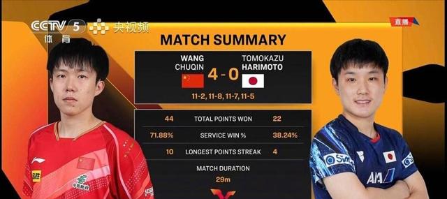 结果王楚钦以4比0的比分横扫对手,赢得干净利落。