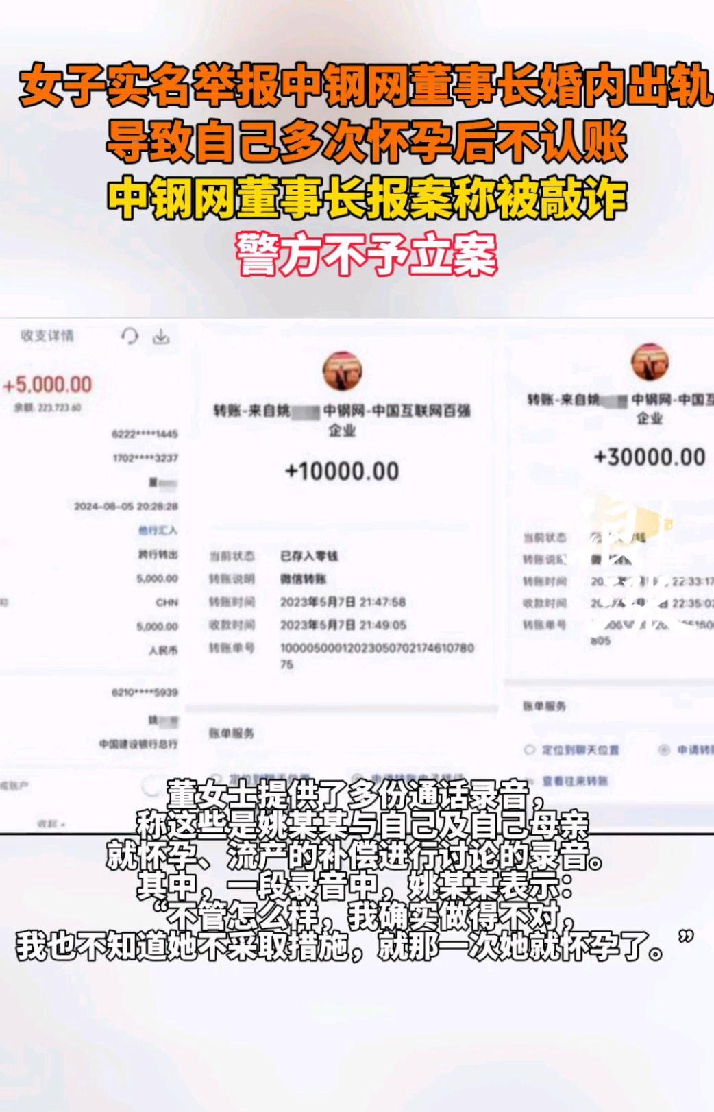 “德不配位,必有灾殃”,这句古话在2025年春天因一起实名举报事件再次被推上风口浪尖。4月,河南郑州的社交平台上,一段手持身份证的举报视频闹得沸沸扬扬。视频中,33岁的董女士声泪俱下,指控河南中钢网董事长姚某某婚内出轨致其两次怀孕流产,并晒出转账记录和通话录音。而54岁的姚某某,头顶“河南省劳动模范”“优秀企业家”的光环,却陷入了一场“私德与公誉”的舆论漩涡。这场纠纷背后,既有普通人对情感伤害的控诉,也有公众人物对名誉的捍卫,更牵扯出警方“不予立案”的蹊跷结果。当道德争议撞上法律界定,当私生活被撕开在公众视野中,人们不禁发问:真相究竟藏在录音的只言片语里,还是淹没在转账记录的金钱往来中?