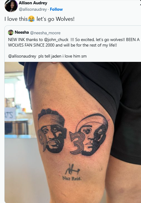 森林狼最近在季后赛的表现让球迷们彻底嗨翻。就在第三场比赛前,一位超级粉丝在X平台上晒出了自己新纹的纹身——直接把麦克丹尼尔斯和队友尼基尔·亚历山大-沃克的头像和球衣号码纹在了腿上。奥黛丽看到后也第一时间转发互动,写下:“我丝。我们加油,森林狼队!”简短的话语,满满的热情。自从麦克丹尼尔斯在2020年来到明尼苏达,他和奥黛丽就慢慢融入了这座城市。森林狼的支持者们也把他们当成了自己人。这份双向奔赴的感情,如今在季后赛期间被推到了最高潮。