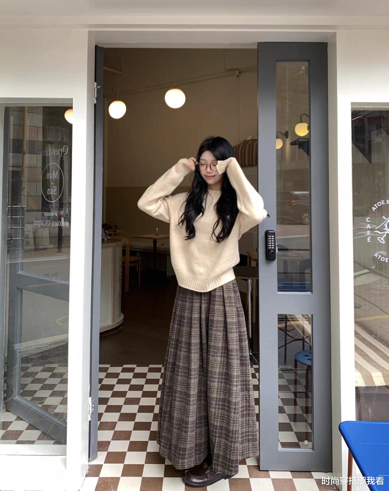 内搭就按照上面的毛衣套路,大衣一裹,格子裙摆在衣角下若隐若现,层次感瞬间就有了。