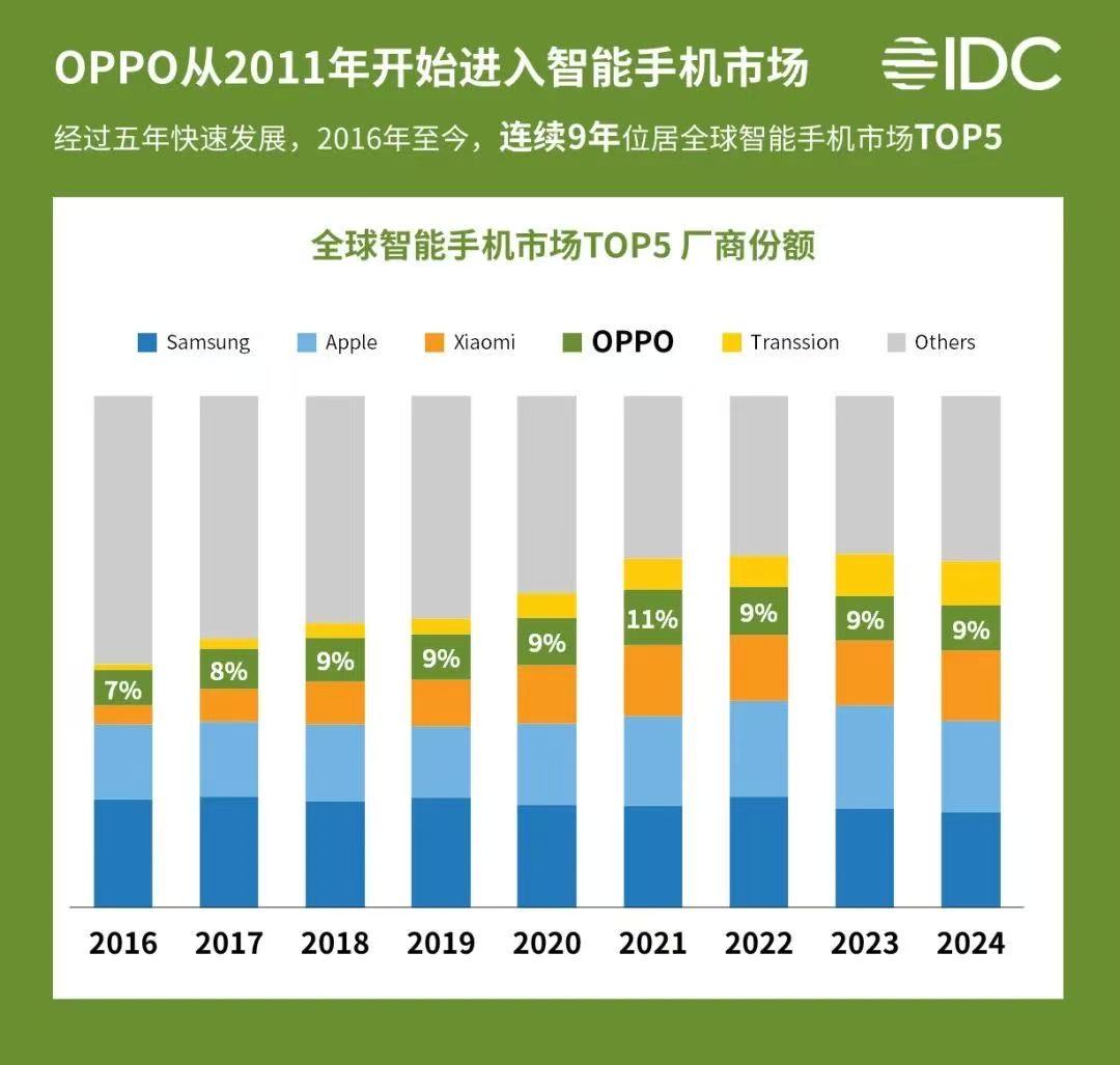(OPPO连续九年位居全球智能手机市场TOP5,来源:IDC)