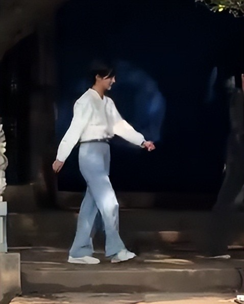 衣摆扎进浅蓝色牛仔裤中,脚上踩着一双干净的白运动鞋,步伐轻快,透着几分慵懒与自在。