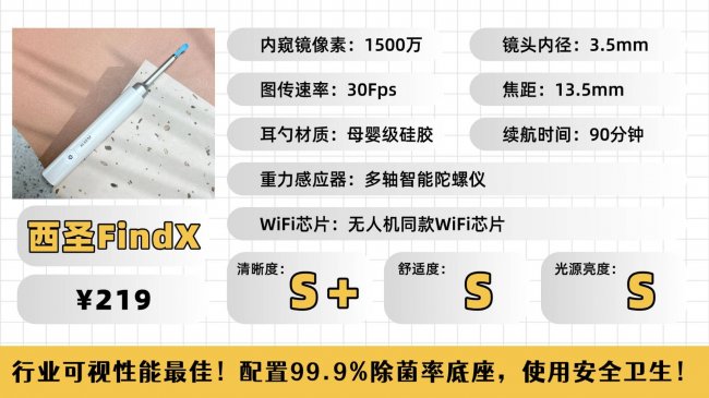 画质表现:西圣FindX可视挖耳勺在配置目前行业最高的1500万的高清内窥镜的基础上,升级了自研的A-Zoom动态调焦技术,2.0版本具有纳米级别的清晰体验,可在100/s实时反馈实现焦点调整,确保图像成像始终保持清晰稳定,耳朵内的耳垢、绒毛都能看得清清楚楚,可避免对敏感区造成不必要的伤害。它还具有智能多轴陀螺仪,云台级别防抖,AI智能算法,能够实时感知并调整挖耳勺的旋转角度和位置。确保了清洁过程中的准确性和稳定性。为了避免耳道内有阴影和暗部区域看不到挖不着的问题。西圣还搭载了6颗全向LED精密光学陈列,360度交叠照亮的光路,交叠的照亮无阴影,避免用户挖错出现安全隐患问题。大量的耳科医生推荐,在中高端品牌领域中,品质口碑始终霸榜第一!