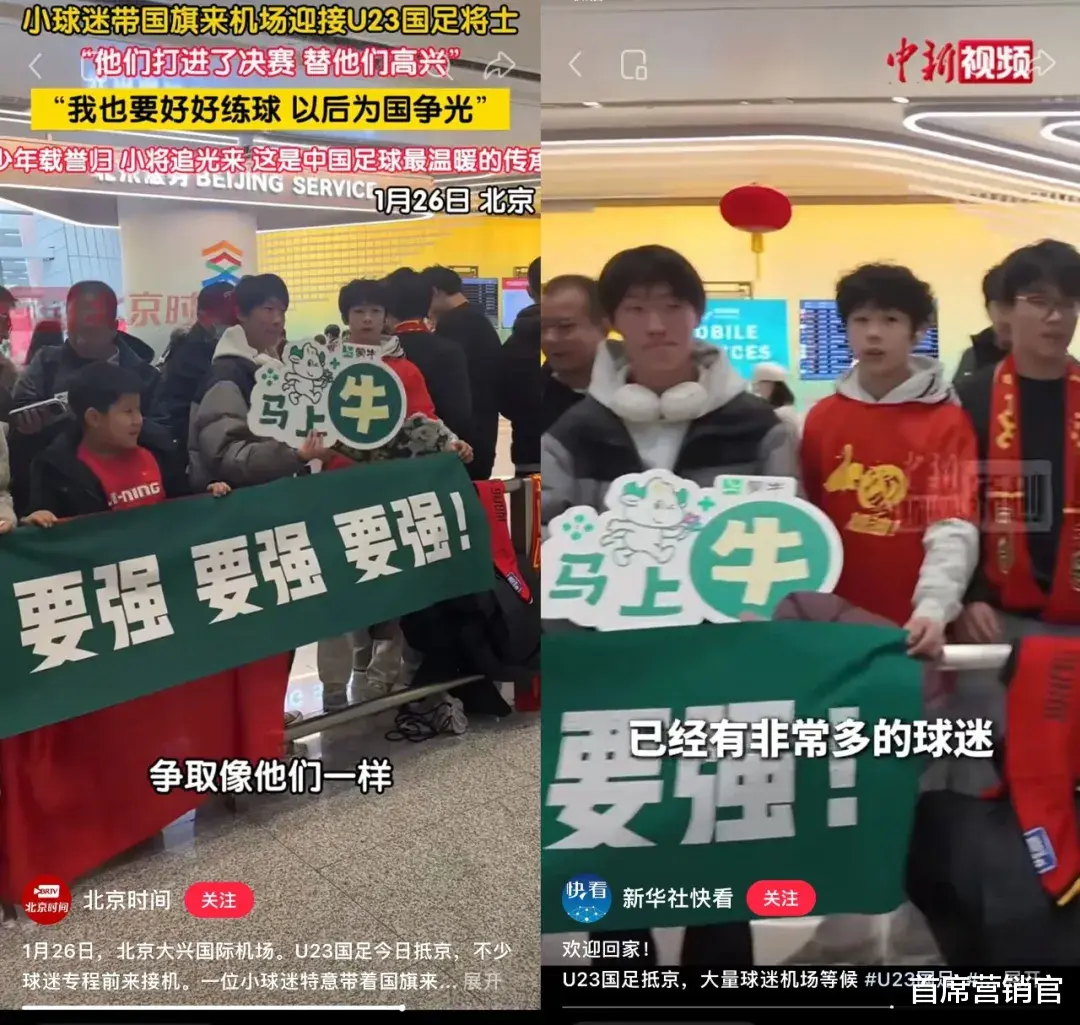 1月26日,一大批年轻球迷到大兴国际机场专程接U23国足的将士们回家,也能看到蒙牛出现在现场,将“要强”主张进一步传递。