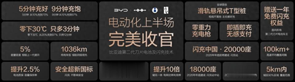 比亚迪六年磨一刀,正式推出第二代刀片电池,通过打造“锂离子高速通道”和“全温域智能热管理系统”,既实现了闪充,也对电池寿命几乎没影响。同时比亚迪还全新开发了闪充桩,单枪充电功率达1500kW,成为全球量产单枪最大功率充电桩!