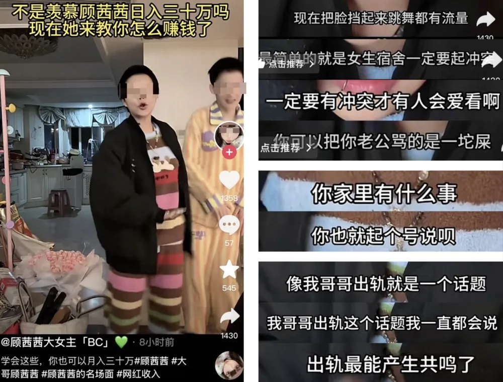 值得注意的是,就在她日入30万引发热议后,一个叫@顾茜茜大女主「BC」的账号火速分享了一条“学会这些,你也可以月入三十万”。视频开头还打上了“不是羡慕顾茜茜日入30万吗?现在她来教你怎么赚钱了”。