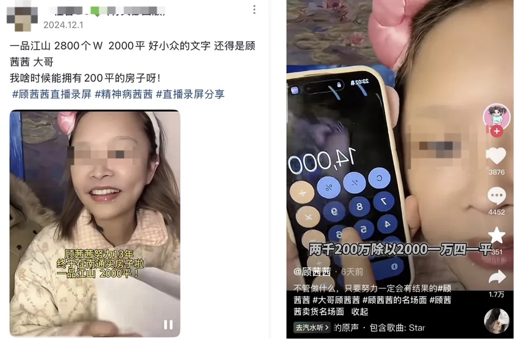 自2024年12月,顾茜茜多次在她的视频中提及,要花2800万元购买一套2000平米的豪宅。