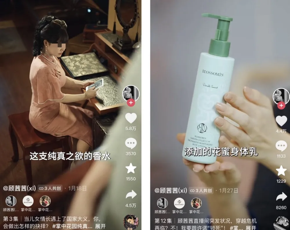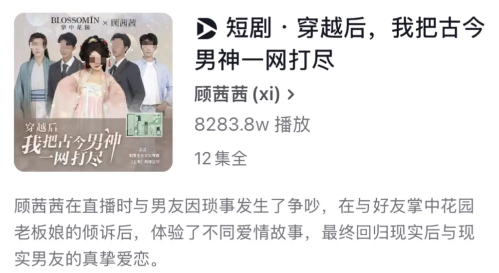 她还涉猎了短剧行业,已联合一个名叫“掌中花园”的香氛、洗护品牌,生产了一部名叫《穿越后,我把古今男神一网打尽》的短剧,共12集,已获得8200万播放。