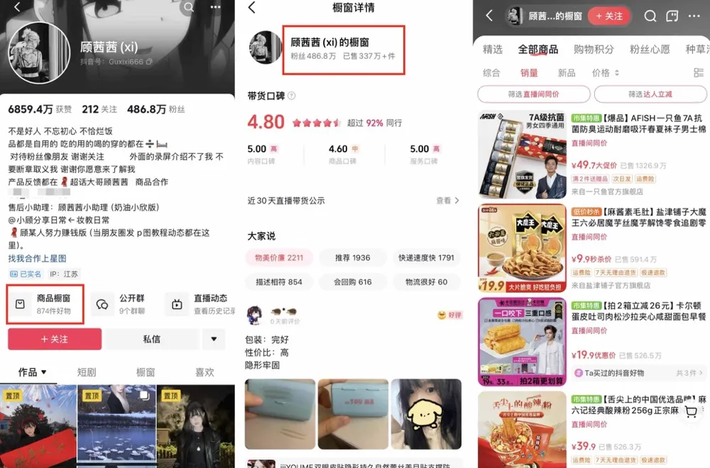 短视频带货平台显示,顾茜茜是一位拥有486万粉丝的带货博主。目前,她的账号里共上架了近900件商品,已销售出377万+件,带货商品品类为衣服、零食等。