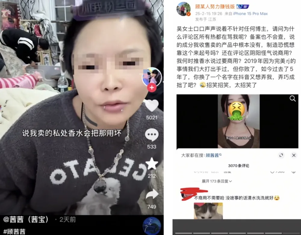 此外,前两天(2月15日),顾茜茜还在直播中还自曝,有博主指责她带货的私处香水有问题,引导网友骂她。