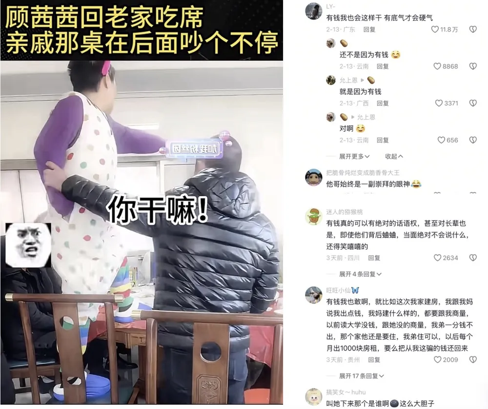 今年春节期间,顾茜茜发布的“回老家吃席”视频中,坐她后桌的亲戚吵个不停,她直接站上桌子怒对亲戚。