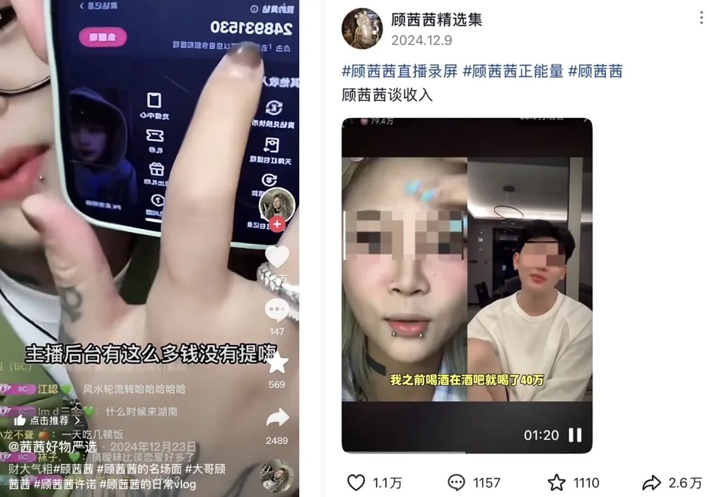 她还多次在视频和直播中提到自己的收入,展示后台超10万元的收入截图。在一次直播连线中,顾茜茜爆料,自己去酒吧一次就消费了40万元……