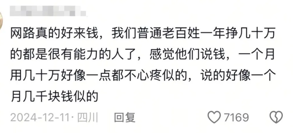 有网友在顾茜茜的视频下,心酸评论:“网路真的好来钱,我们普通老百姓一年挣几十万的都是很有能力的人了,感觉他们说钱,一个月用几十万好像一点都不心疼似的,说的好像一个月几千块钱似的”。