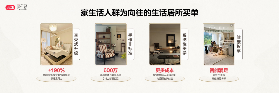 例如,在小红书,智能床、全屋智能、智能家居等搜索同比上涨了190%;618期间某家居博主一场直播就把彝族非遗元素的赤乌椅卖到了600万GMV;而在美学、健康方面,用户也提出了更高的要求。与之相匹配的,自然是更高的预算。