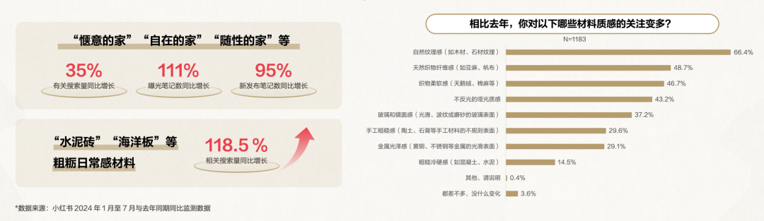 “返璞归真,对天然感上瘾”这个趋势更是能够把商机直观的体现出来:消费者对于惬意、自在、随性的追求,催生了对于自然纹理感材质的兴趣。“水泥砖”、“海洋板”等粗粝日常感的材料搜索量暴增 - 这对于家具建材的品牌来说,无异于提供了一个产品创新方向的指引。