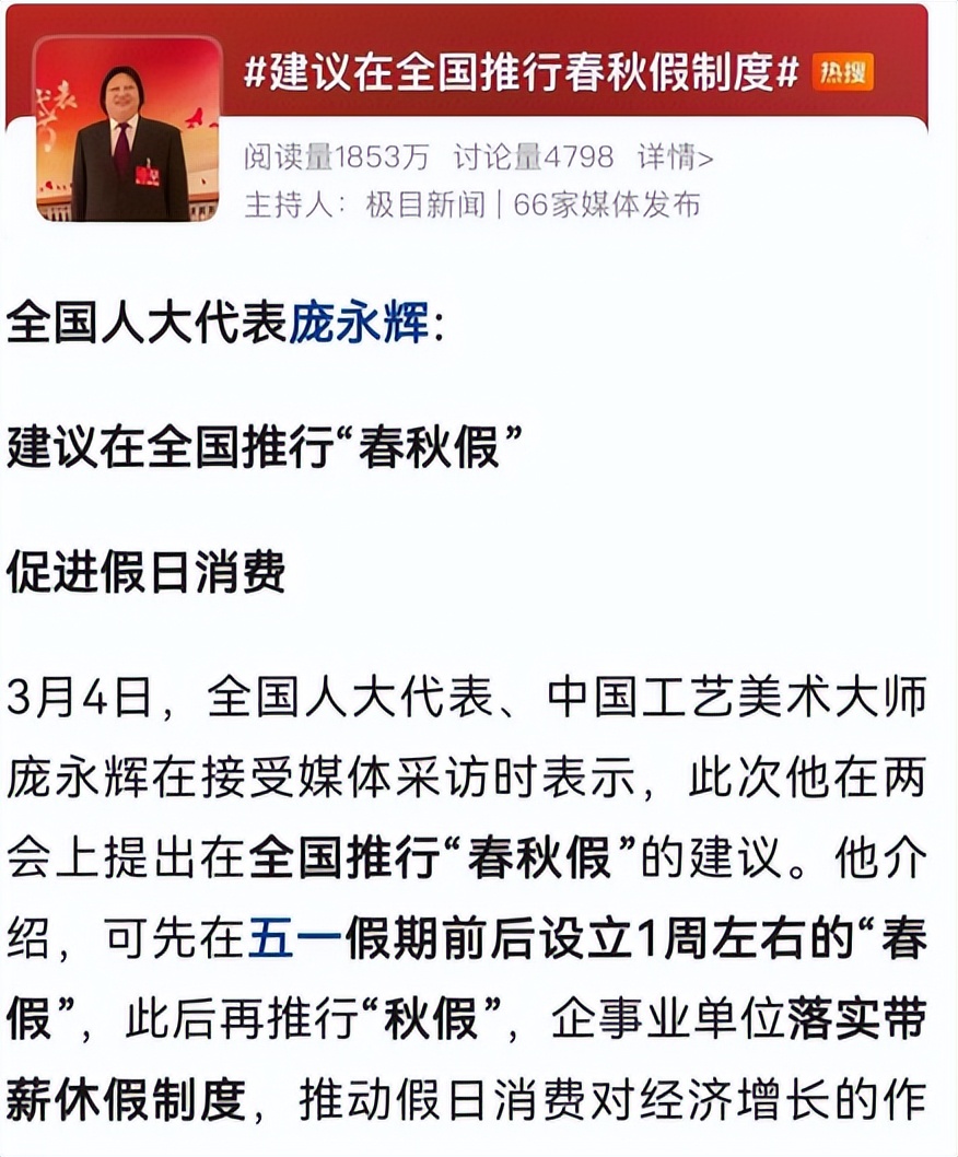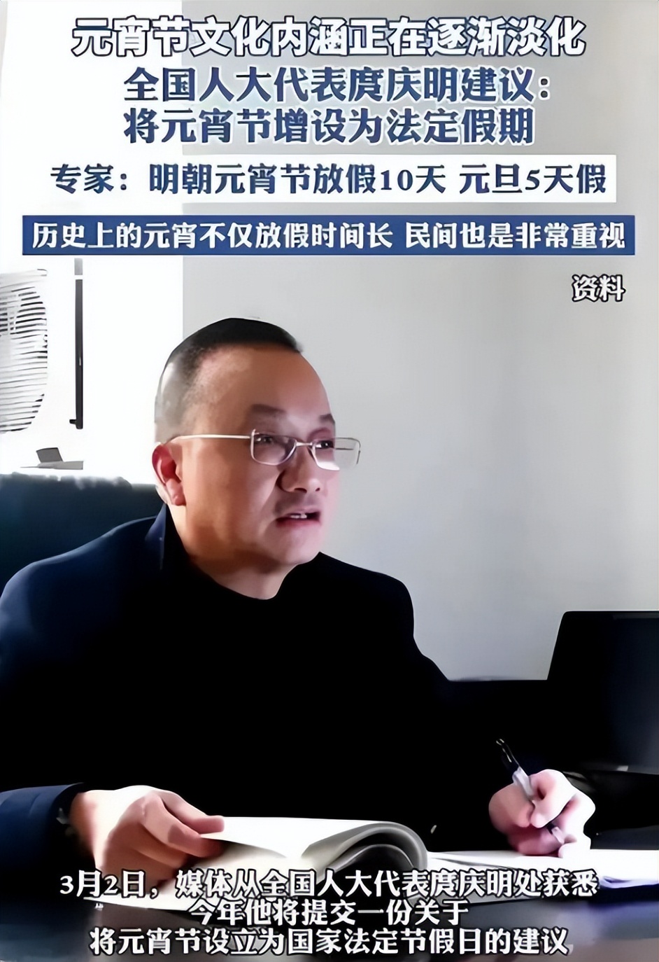 其实关于假期这件事情,并非是只有霍启刚一人提出,3月2日这天,我们的人大代表庹庆明就表示,他将会在今年提出一份关于元宵节设为国家法定节假日的建议。