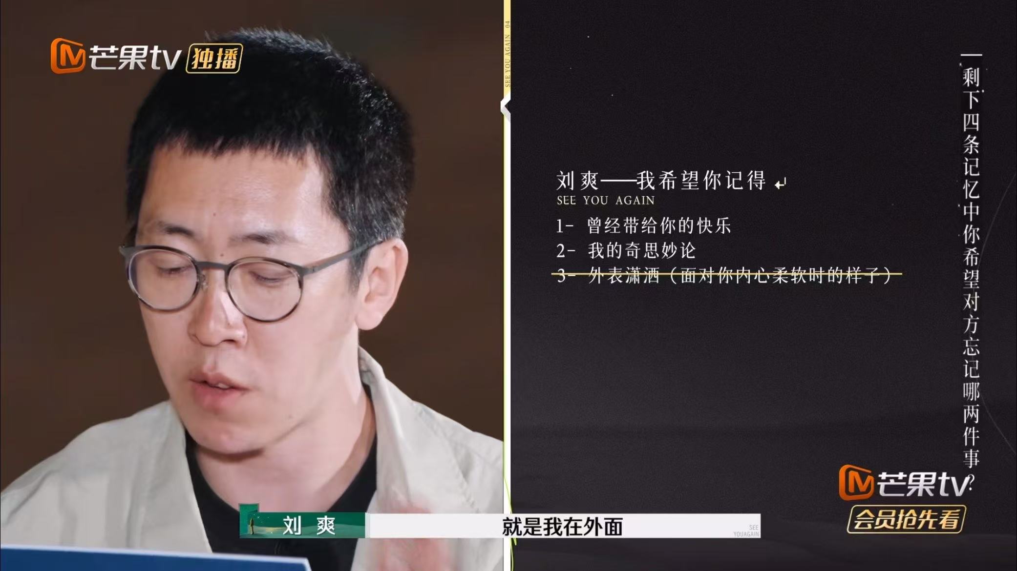 刘爽五条只写出三条,最后留下的是“快乐时光”,他说自己的奇思妙想是自己的精神遗产,葛夕继承不了,葛夕说自己就是因为刘爽的那些奇思妙想而喜欢他的,但是刘爽说,自己走了就会把这些精神遗产也带走,不会留给葛夕。其实这个时候,我们已经能够感受到他有多自私了。