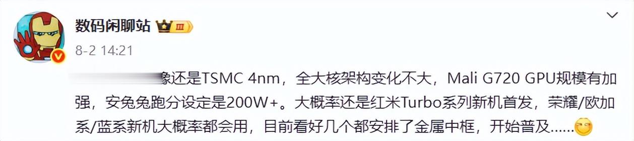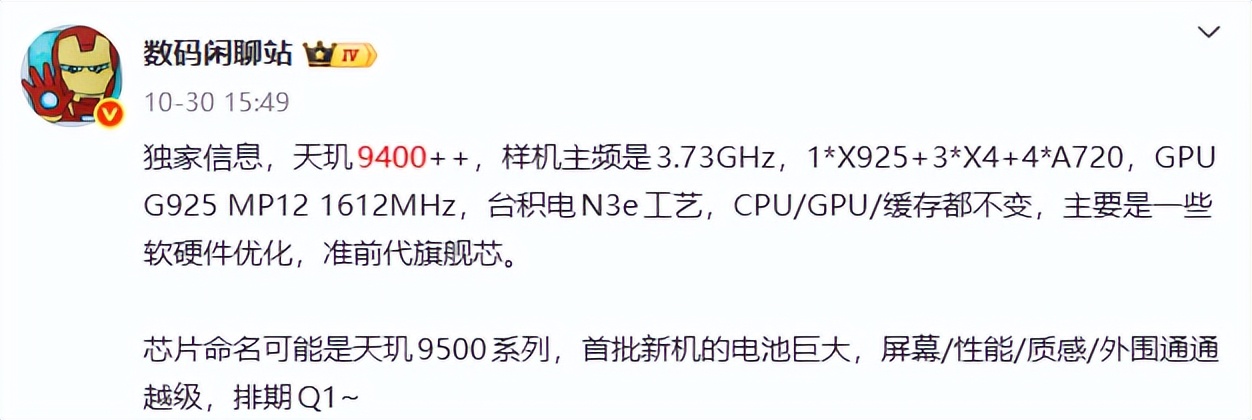 也就是红米 K80 至尊版那颗天玑 9400+ 的小升级版~
