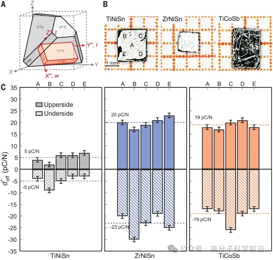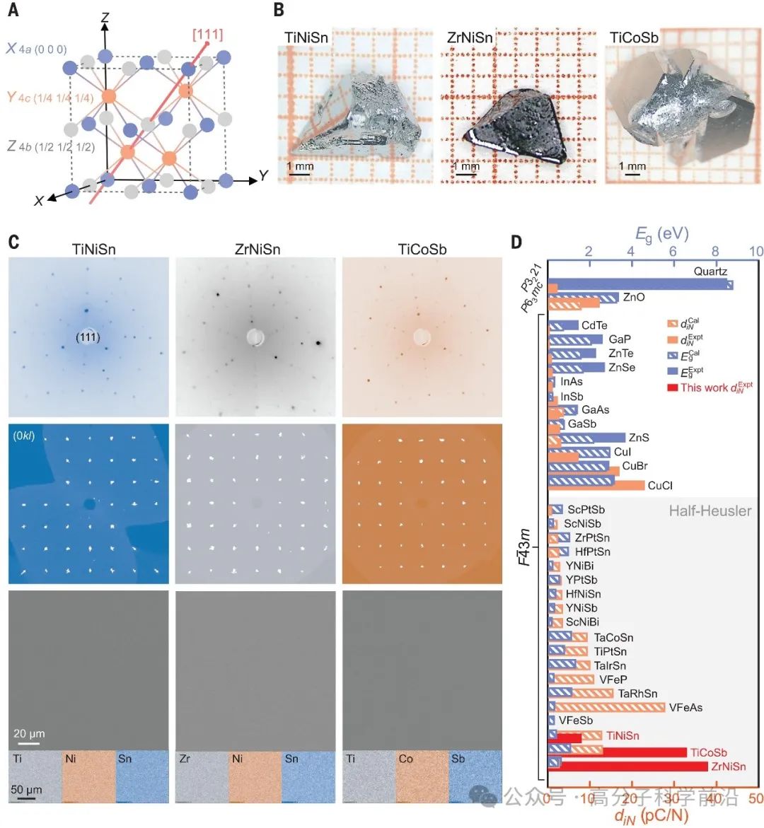 作者研究了多晶 TiNiSn、ZrNiSn 和 TiCoSb 的压电效应,测得了它们的纵向 PE 应变系数 d,使用准静态方法进行测试。尽管这些材料具有较高的导电性,它们仍表现出可观察到的 PE 响应,d 值约为 5 到 13 pC/N。这种 PE 响应使作者对半 Heusler 化合物(HH SCs)的进一步研究产生了兴趣。为了获得高质量的单晶,作者使用自熔量法生长了 TiNiSn、ZrNiSn 和 TiCoSb 的单晶,并通过 XRD确认其单晶性质(图 1C)。这些材料的晶体结构属于立方体结构(空间群),并且与模拟结果一致。经过 XRD 和电子探针微量分析,作者确认了这些晶体的成分和结晶度(图 1C)。接着,作者对单晶 TiNiSn、ZrNiSn 和 TiCoSb 的 PE 性能进行了测量,发现它们的剪切 PE 应变系数分别为 8、38 和 33 pC/N(图 1D),在某些情况下,它们的 PE 系数比传统的硅材料高出一个数量级。最后,作者测量了单晶的 PE 应变系数并进行了详细的分析,结果表明 TiNiSn 的 PE 系数最小,而 ZrNiSn 和 TiCoSb 则几乎相等。这些结果为 HH 化合物在 PE 性能方面的应用提供了重要数据。