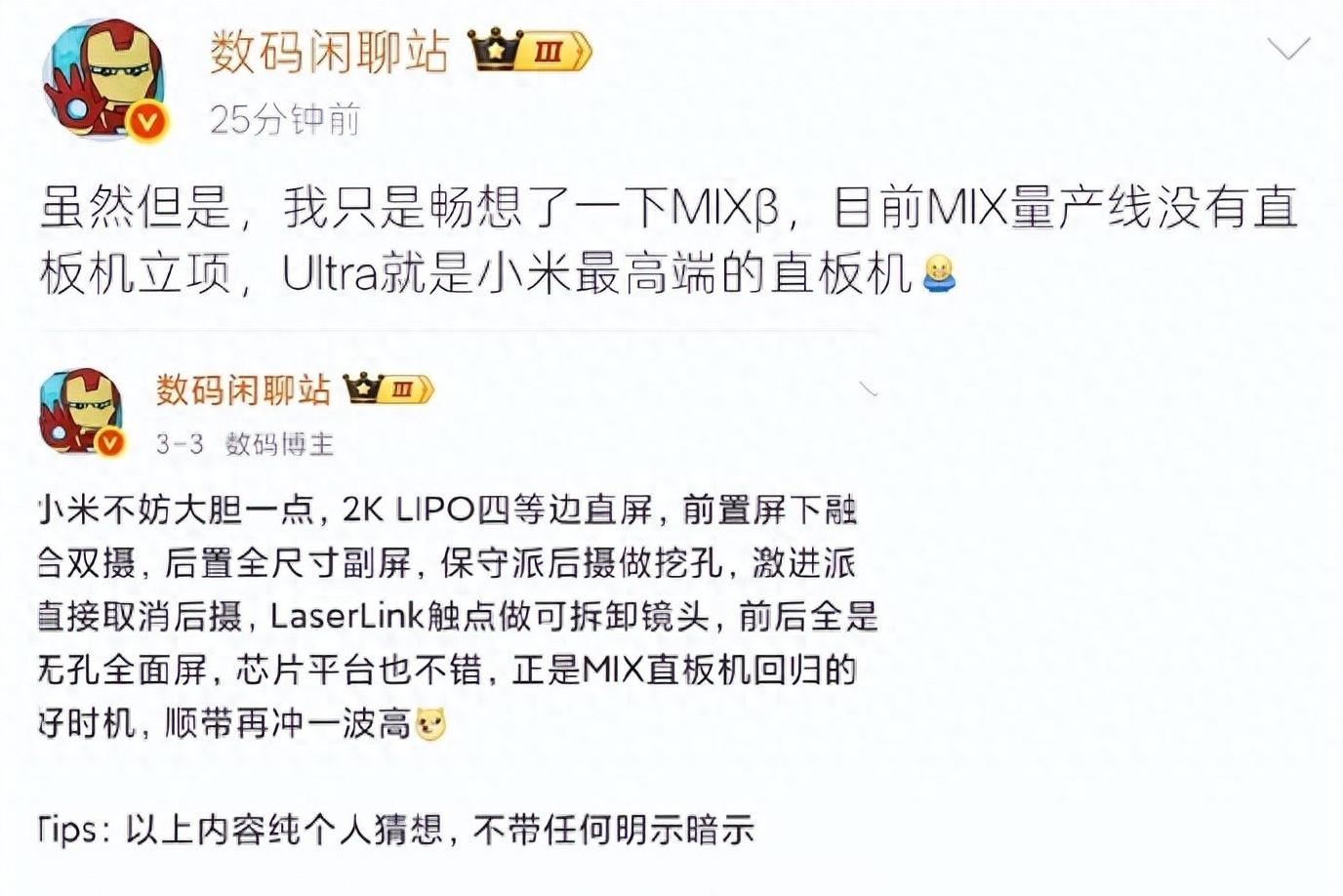 数码博主@数码闲聊站明确表示,小米MIX直板机回归只是“个人猜想”,目前没有任何计划。