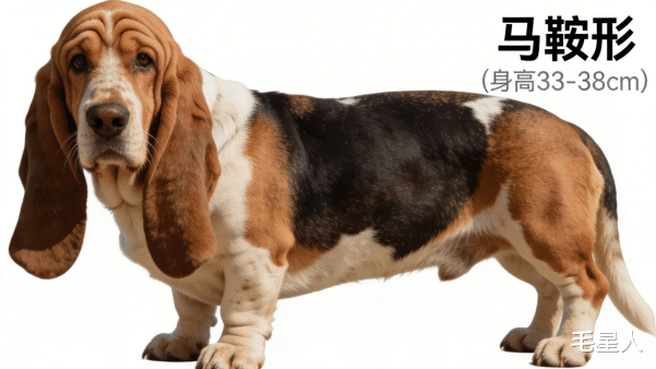 属中型猎犬,成年犬身高33-38厘米,体重18-27千克,体长显著大于肩高,呈典型的“长身短腿”结构。骨骼粗壮沉重,肌肉发达紧实,虽体态低矮却不失力量感,能长时间承受追踪狩猎的体力消耗。