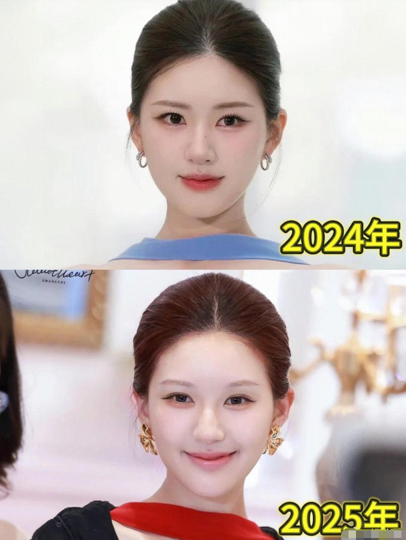 原来的赵露思是一张圆圆的脸,五官不够立体,但胜在清纯可爱,但现在的她高鼻梁大眼睛尖下巴欧式双眼皮,虽然五官精致了,但跟以前的她判若两人,看着比她实际年龄大,气质也变得更加成熟淡定和明艳张扬。