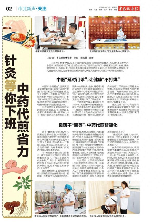 上班族们想看中医,但是上班时间和医院门诊开诊时间重合,怎么办?患者把中药拿回家,煎药时却犯了难,应该怎么煎?为了让群众在家门口获得更加优质、健康、便捷的医疗服务,今年以来,市北区不断提升基层中医药服务能力,开展中医药延时服务,引入全自动煎药机,为患者提供代煎药服务,满足人民群众对中医诊疗多样化的需求。