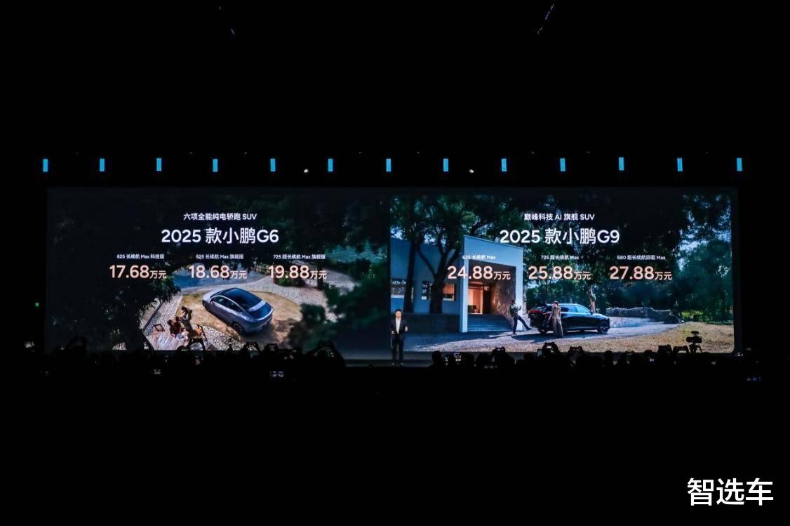 六项全能纯电轿跑SUV 2025款小鹏G6发布三个版本,包括长续航 Max 科技版、长续航 Max 旗舰版和超长续航 Max 旗舰版,官方指导价分别为17.68万元、18.68万元和19.88万元。巅峰科技AI旗舰SUV 2025款小鹏G9发布三个版本,包括长续航 Max、超长续航 Max和超长续航四驱 Max,官方指导价分别为24.88万元、25.88万元和27.88万元。
